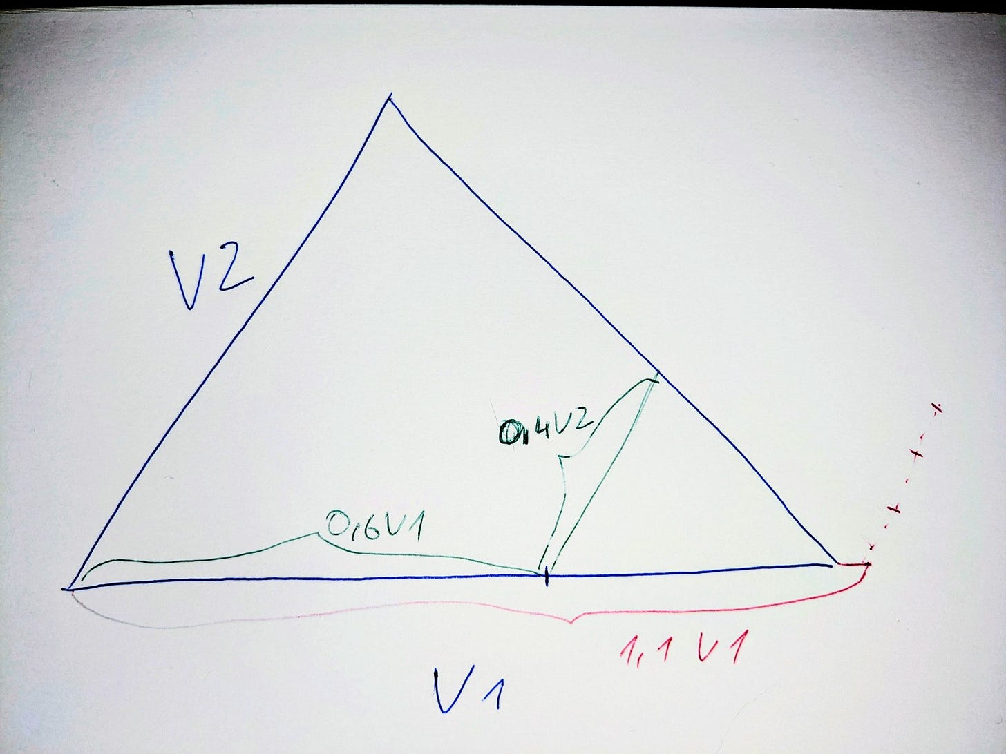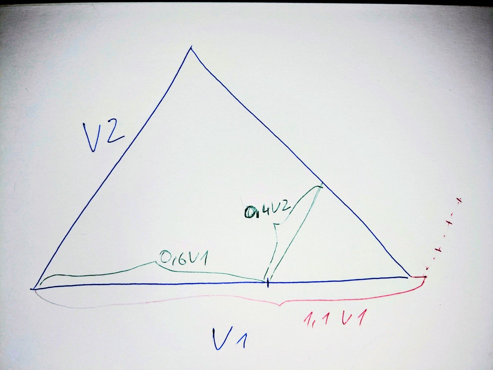 Based on the similar triangles rule, all edges of the small triangle are in the same ratio to the edges of the big triangle, if all angles are equal. If we have a*V1 then b < 1-a which I can rewrite as